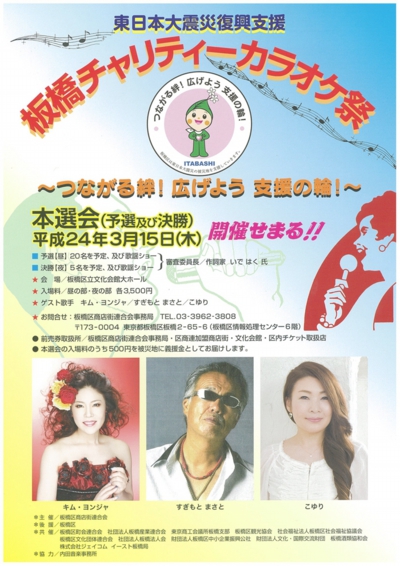 24年3月15日(木)板橋区立文化会館大ホールにおいて、東日本大震災復興支援「板橋チャリティーカラオケ祭」が盛大に開催されました。