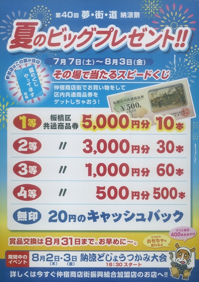 期間中300円お買毎に福引補助券を差上げ10枚にて抽選が1回出来ます。景品は新橋演舞場の観劇券・ディズニーランドの入場券等をはじめ、すばらしい景品が空クジなしで当たります。