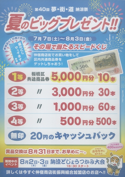 お買上げ400円毎に補助券1枚、補助券5枚で1回抽選できる。景品に観劇や区内共通商品券、ビールなど