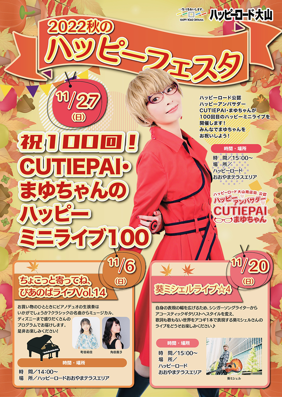 ハッピーロードの公認ハッピーアンバサダーCUTIEPAI・まゆちゃんが100回目のハッピーミニライブを開催します!みんなでまゆちゃんをお祝いしよう!