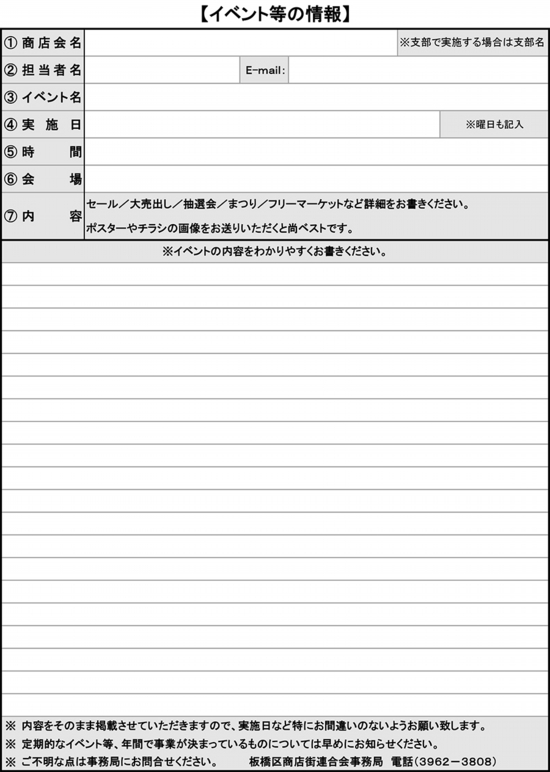 イベント情報をエクセルのデータに書き込んでメールに添付して送信ください。写真などの画像がある場合にはメールの方にご一緒に添付して送信してください。