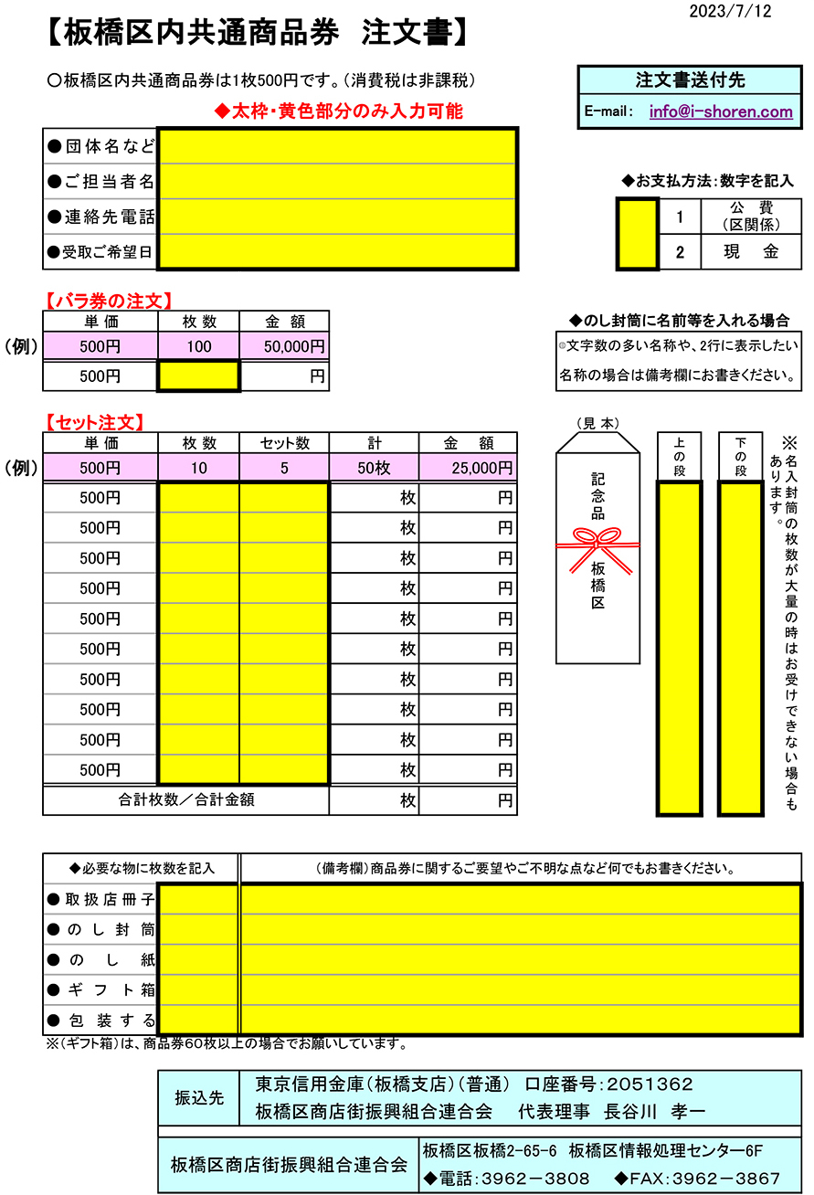 板橋区商店街連合会 板橋区情報処理センター6F TEL 03-3962-3808 FAX 03-3962-3867