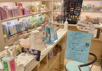 | ビューティふたば | 化粧品店 | アルコール消毒・パーティション・席数減など十分に徹底した感染対策を行い、明るく清潔で整理整頓された店内。 |