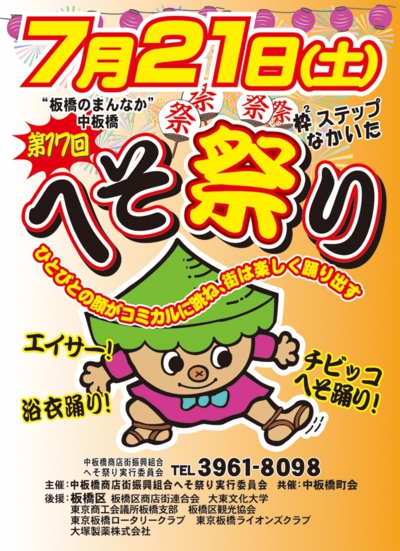 へそ祭りは、今年第17回をかぞえ様々な踊りを取り入れたお祭りイベントになります。各時間帯に様々な出演者が、パフォーマンスを繰り広げ、最後に板橋の真中「中板橋」でお腹を顔に見立て地域ならでわのへそ踊りを行います。当日商店街に長時間滞在してもあきないお祭りです。