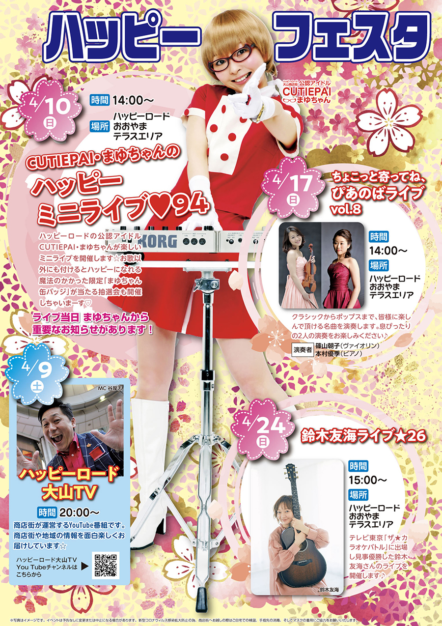 ハッピーロードの公認アイドルCUTIEPAI・まゆちゃんが楽しいミニライブを開催します☆お歌以外にも付けるとハッピーになれる限定「まゆちゃん缶バッジ」が当たる抽選会も開催しちゃいま~す♡